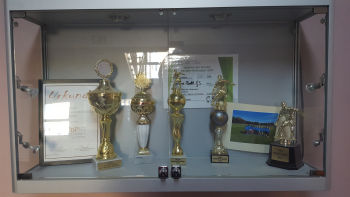 Ein Schaukasten zeigt die Auszeichnungen der Schule.