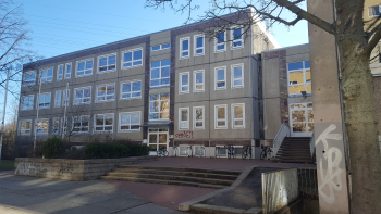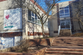 Von der Straßenbahn kommend sahen wir am an der Straßenecke gelegenen Gebäude das große Plakat mit dem Hinweis auf die „Schule mit Herz“.