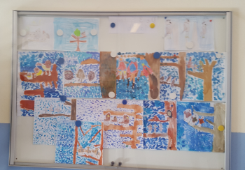 Hier eine Ausstellung von Bildern der Kinder: Vögel im Winter im Vogelhäuschen und auf Bäumen.