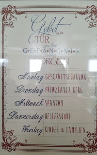 An der Wand des Raumes hängt gerahmt ein Wort von Helmut Gollwitzer: „Gebet ist die Tür aus dem Gefängnis unserer Sorgen.“ Dann folgen die Wochentage und der Vorschlag, für wen gebetet werden möge: montags für die Geschäftsführung, dienstags für (die Schule im) Prenzlauer Berg, mittwochs (für die) in Spandau, donnerstags (für die Schule hier) in Hellersdorf und freitags für die Kinder und Familien.