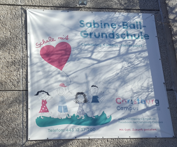 und etwas weiter hinten ein ähnlich großes Plakat als Hinweis auf die dort befindliche Kita „Helles Nest“ und den Träger: „Christburg Campus“.