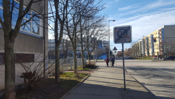 Beim Verlassen der Schule fällt unser Blick auf die gegenüber liegende Strassenseite, das markante Gebäude des Sozialamts in der Riesaer Str. 94 und des Ausstellungszentrums Pyramide. Die Lichtenheiner Straße 2 ist also ganz leicht auch für Ortsfremde zu finden.