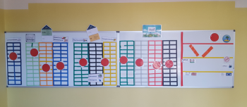An der rechten Seite ist ein bunter Raumplan zu sehen, um im Haus auf wichtge Räume aufmerksam zu machen: das Knusperstübchen, die Lernwerkstatt, den Dschungel, die Bauecke & Nimmerland und Phantasialand – Angebote für die Kinder, die wir bei laufendem Unterrichtsbetrieb früh um 9 Uhr natürlich nicht besichtigen können.