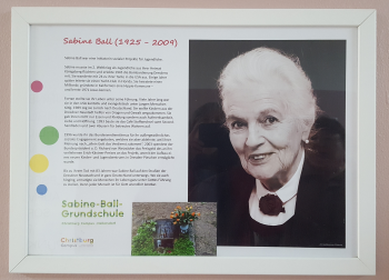 2014 wurde die 2006 als Arche-Grundschule gegründete Grundschule umbenannt und damit die Dresdenerin Sabine Ball geehrt, so auch mit diesem Bild von ihr im Foyer. Eine aus unserer Gruppe hat sie persönlich kennengelernt und erzählte, dass sie immer eine weiße Bluse mit Brosche daran trug, wie auf diesem Bild, auch wenn sie in der Küche stand und sich dabei um die Straßenkinder von Dresden in den 90er Jahren bemühte. Wer sich mit ihrem Leben beschäftigt, wird über die Kraft des Glaubens und der Liebe staunen, die von Jesus ausgeht und unter uns wirkt und Menschenleben verändert.