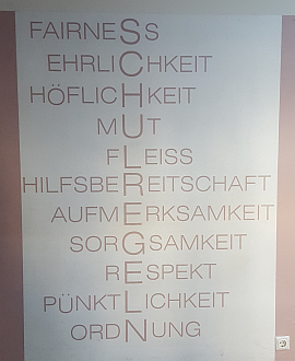 Groß an die Wand im Schulflur gemalt sind die Schulregeln, wie sie auch mit fröhlichen Farben im Leitbild zu lesen sind: