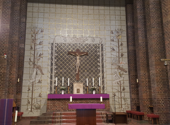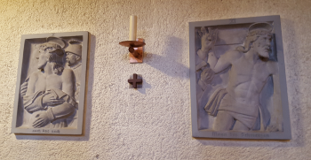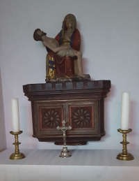 Der Taufaltar aber zeigt die „Pieta“ - die trauernde Mutter Maria mit ihrem toten Sohn.