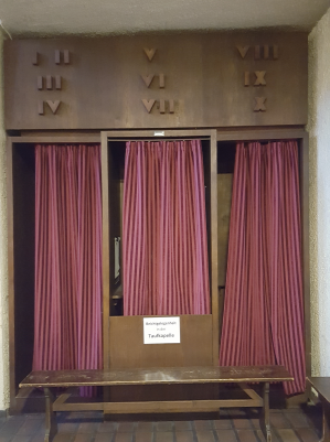 An der hinteren Stirnwand des großen Raumes sind jeweils Beichtstühle untergebracht.