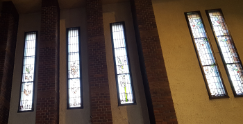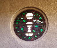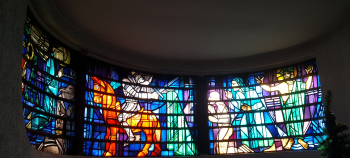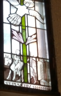 In der Taufkapelle erinnern diese bunten Fensterbilder wieder an den heiligen Martin.