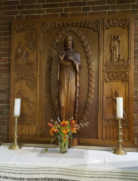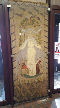 Durch diesen Aufsteller ist im Moment ein Marienbild nicht zu sehen, das von der Frau Perathoner aus Stoffen gestaltet wurde.