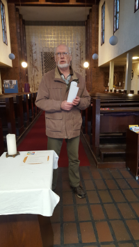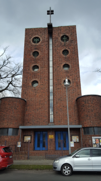 Herzlich begrüßt am Eingang zur Kirche gingen wir erst einmal auf die andere Straßenseite um das Bauwerk zu betrachten, das im Stil der Neuen Sachlichkeit geplant und 1929/30 erbaut wurde. Auffallend ist neben dem Baustil das Kreuz oben auf der Spitze mit doppeltem Querbalken, wobei der obere das Schild bedeuten soll, auf dem stand: „Der Juden König“.