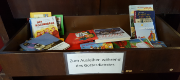 Zurückgekehrt zum Eingang der Kirche fällt dies hier auf. Für die Kinder im Gottesdienst liegen Bilderbücher bereit mit christlichen Geschichten.