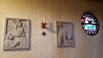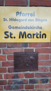 Gerade neu angebracht wurden zwischen den beiden blauen Eingangstüren diese beiden Schilder, das gelbe und das braune darunter. Seit 1. Januar gehört die Kirche zur neu gegründeten großen Pfarrei Hildegard von Bingen. Die Namenspatronin wird mit dem unteren braunen Metallrelief geehrt.