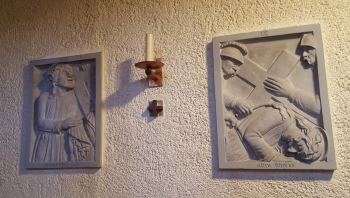 Die 12 Kerzen und Kreuze zwischen den Stationen erinnern an die 12 Apostel.