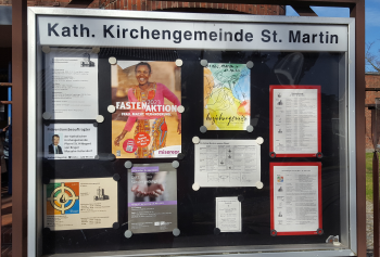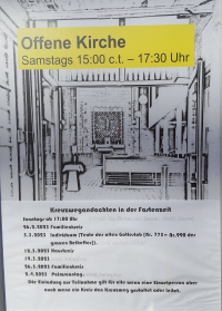 Am Zaun zur Giesestrasse lädt dieser bunt gestaltete Schaukasten ein, die Gottesdienste und Veranstaltungen der Gemeinde zu besuchen. Daneben lädt ein weiterer kleiner Schaukasten ein, samstags von 15.15 Uhr bis 17.30 Uhr die dann offene Kirche zu besichtigen bzw. sie zu nutzen für die eigene Andacht und Gebet.