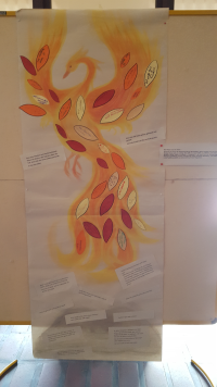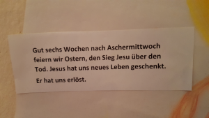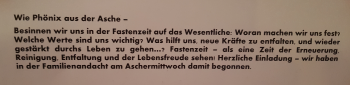 Mit Kindern wurde dieser Phönix gestaltet, der in der Mitte zwischen den beiden Eingangstüren zu sehen ist. Ihre Namen stehen in den Federn und rings herum Erklärungen zur gegenwärtigen Fastenzeit wie diese hier: