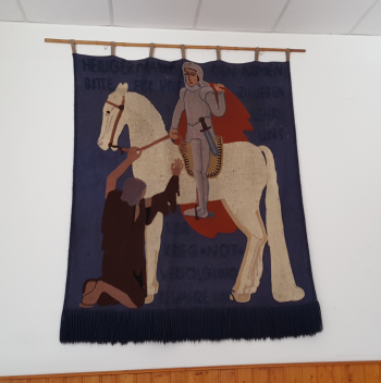 Auch hier im Saal erinnert ein großer Wandbehang an den heiligen Martin.