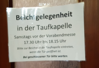 Dort weist ein weiteres Schild auf die Zeiten hin: samstags von 17.30 Uhr – 18.15 Uhr vor der Vorabendmesse.