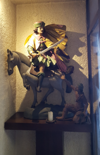 In einer Nische neben der Taufkapelle gleich neben dem Eingang zur Kirche steht St. Martin als geschnitzte Holzfigur, wie er gerade seinen Mantel mit dem Schwert zerteilt, um die eine Hälfte dem frierenden Bettler zu geben.