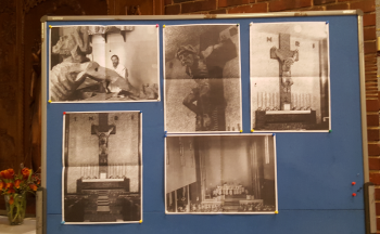 Doch das war nicht immer so. Links daneben steht eine Schautafel zur ursprünglichen Gestaltung mit einem steinernen Kreuz aus rotem Backstein und daran die von Hans Perathoner 4 Meter hohe Christusfigur, gearbeitet aus einem Stück Eichenholz unter dem Eindruck der Schrecken und Gewalt des 1. Weltkrieges. Schon 1931 wurde sie wieder abgenommen, lag lange auf dem Dachboden, kam dann in die Hoffnungskirche Pankow und hängt heute in der Kirche „von der Verklärung des Herrn“ in Marzahn.
