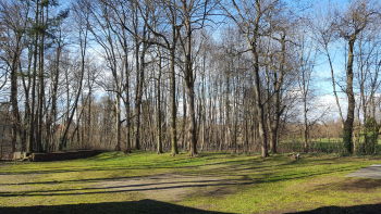 Draußen, hinter dem Haus steht der Gemeinde eine große Wiese umgeben von hohen Bäumen für Gemeindeveranstaltungen zur Verfügung. Ursprünglich war auf diesem Gelände mal eine Gaststätte „Zum wilden Eber“, an einem See gelegen. Wegen des gesunkenen Grundwasserspiegels ist von diesem See schon lange nichts mehr zu sehen.