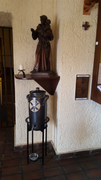 Beim Verlassen der Kirche fällt uns noch ein großes Weihwassergefäß auf: Wasser zum Mitnehmen!