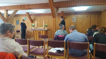 Die hier von uns erlebte Gemeinde ist klein, aber geschlechter- und altersmäßig optimal, wie einer aus unserer Runde feststellte: zur Hälfte Männer, zur Hälfte Frauen, 8 Kinder. Auch noch weitere junge Familien gehören dazu, so dass die Gemeinde hoffnungsvoll in die Zukunft blickt. Für uns ungewöhnlich war es, dass vor Beginn des Gottesdienstes zwei Männer, die Diakone der Gemeinde den Altar „einrahmen“ - in stillem Gebet, was anregt, sich still auf das Folgende vorzubereiten.
