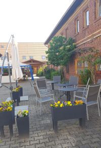 Im Anschluss an den einstündigen Gottesdienst nahmen wir hier auf dem Hof vor dem Gemeindehaus Platz und waren mit dem Priester der Gemeinde Herrn Strauß, seiner Frau und Bischof Müller im Gespräch. Wir erfuhren, dass beide voll berufstätig sind, Priester Strauß als Radio-und Fernsehtechniker, Bischof Müller als Kfz -meister. So haben sie montags wirklich keine Zeit, noch hierher zu kommen, denn auch die Arbeitswege sind weit. In unserem Gespräch ging es vor allem auch um seelsorgerliche Fragen, die uns alle bewegen. Dabei betonten beide Gesprächspartner, wie zentral für sie die Gewissheit eines Lebens nach dem Tode dank Jesu Jesu Tod und Auferstehung ist.