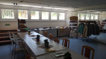Davon erzählen auch die hier ausliegenden und an Ständern hängenden Kleiderspenden. Der Raum wirkt noch größer durch die Spiegelwand. Hier im Keller hat die Jugendarbeit in diesem Haus mal angefangen. Die Spiegel dienen für Tanzübungen.