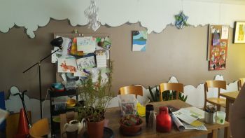 Die Räume werden je nach Bedarf und Gruppengröße umgeräumt und neu gestaltet. Wir besuchen zuerst den Raum für die Kinder.