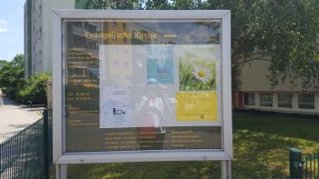 Am 23. April dieses Jahres wurde mit einem Tag der offenen Tür der 30. Geburtstag des Schülerzentrums „Kraftwerk“ gefeiert, wozu u. a. in der „Berliner Woche“ eingeladen1 wurde. Das Schülerzentrum teilt sich das Gebäude mit der evangelischen Kita „Regenbogen“, die wir auch noch besuchen wollen. Von der Nossener Straße herkommend fällt zuerst der Schaukasten auf, der auf die Veranstaltungen im nahe gelegenen evangelischen Gemeindezentrum Hellersdorf in der Glauchauer Straße 7 aufmerksam macht. Doch ist sie seit kurzem nicht mehr Träger der Kita, sondern der „Evangelische Kirchenkreis Süd-Ost“, und auch nicht Träger des Schülerzentrums, sondern dies ist der „„Sozialdiakonische Jugendarbeit im Verbund e.V“, in dem u.a. auch der Kirchenkreis Mitglied ist.