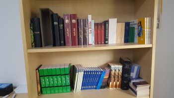 Am Eingang steht ein Regal mit Bibeln: