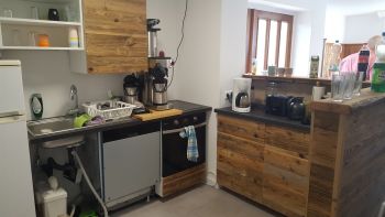Um einen größeren Raum für die Kinder zu haben, wurde die Küche ins Foyer verlegt, so dass den Besuchern stets gleich ein Kaffee oder ein anderes Getränk angeboten werden kann. Die neue Küche ist schon fast fertig.