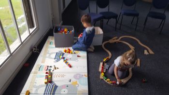 Im Kirchraum ist für uns ein Stuhlkreis gestellt, doch wir sind anfangs nicht so viele und bleiben in der Sitzecke. Dafür können unsere mitgebrachten Kinder hier solange spielen, wie wir reden.