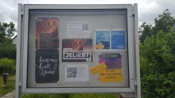 Im Schaukasten steht in der Mitte der Satz: „Du bist jeliebt“ mit dem Zusatz „de“, also dem Hinweis auf die entsprechende Webseite, die auch für weitere Informationen per dem her gezeigten QR-Code mit dem Handy leicht aufgerufen werden können, nämlich die Webseite www.jeliebt.de/begegnungszentrum