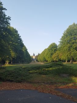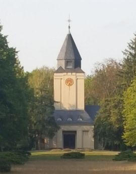 Obwohl der Fußweg von der Endhaltestelle der Straßenbahn M8 und 16 nicht weit ist, waren etliche aus unserer Gruppe von Marzahnern das erste Mal hier. Vor der Dorfkirche Ahrensfelde muss man in die Lindenberger Straße einbiegen, dann geht es geradeaus und hinter der S-Bahnschranke rechts in die Ulmenallee. Dort kommt man dann geradewegs auf den Eingangsbereich des Friedhofs, der mehr einem Schlosspark gleicht. Gräber sind für den Besucher erst einmal nicht zu sehen, sondern Wald und Wiese und weit hinten, das Bild bestimmend, die Kapelle.