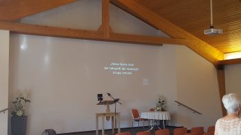 Der helle freundliche Saal bietet ca. 150 Menschen Platz, ist gut gefüllt und technisch bestens ausgestattet. Auf dem kleinen Bildschirm am Pult kann der die Versammlung leitende Älteste alle sehen, die per Zoom dabei sind und auch sie einbeziehen.