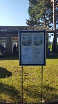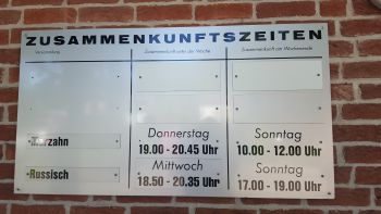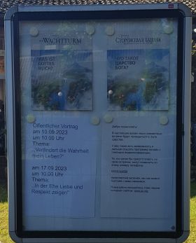 Auf der Wiese steht ein Schaukasten mit den Versammlungszeiten, links auf Deutsch und rechts auf Russisch.
