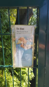 Im Eingangstor des Grundstückszauns kann man sich ein Flyer mitnehmen „Die Bibel. Was für ein Buch ist das?“