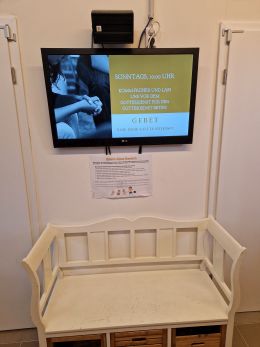 Rechts vom Eingang geht es durch einen Flur zu einem zweiten Kinderraum, in dem während der Predigt die Kinder von 3 bis 6 Jahren ihre Sonntagsschule haben. Im Flur ermöglicht dieser Bildschirm, den Gottesdienst zu verfolgen, so wenn Babys gefüttert werden.