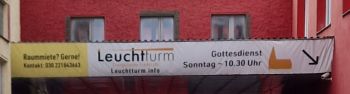 Das große Banner mit den Hinweisen auf den Eingang, den Gottesdienst dieser evangelischen Freikirche sonntags um 10.30 Uhr und die Internetseite leuchtturm.info ist von der Straße aus gut zu sehen.