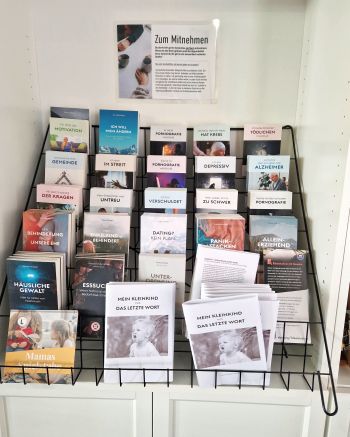 An der Eingangstür zum Saal stehen Schriften zum Mitnehmen, so auch zur Kindererziehung.