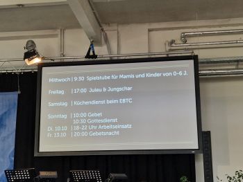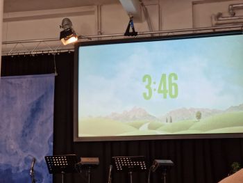 An der großen Leinwand wurde die Zeit bis zum Beginn des Gottesdienstes mit Minuten und Sekunden angezeigt. Bis auf die Feier des Abendmahls ist er auf der Internetseite der Gemeinde mitzuerleben, so auch die Predigt von Alexander Benner über: