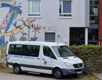 Vor dem Haus steht ein Kleintransporter, auf dem der Träger des Hauses steht: die Tiele-Winckler GmbH, benannt nach der Gründerin diakonischer Einrichtungen und der Schwesternschaft „Friedenshort“ Eva von Tiele Winckler (1866-1930) in Schlesien. Seit 1957 sind die Diakonissen in Freudenberg im Siegerland/Nordrhein- Westfalen und seit 1946 schon im Brandenburgischen Heiligengrabe zu Hause. So gehört die Tiele Winckler GmbH zusammen mit der Stiftung Diakonissenhaus Friedenshort und Evangelische Jugendhilfe Friedenshort GmbH zu „Friedenshort“ und zum Verbund der Diakonie. Diese verschiedenen Namen und das große damit verbundene Netzwerk können verwirren, sind aber bis heute von Eva von Tiele-Winckler geprägt, die großen Wert darauf legte, dass die Betreuten in familienähnlichen Wohngemeinschaften leben.