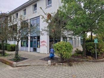 Vom hinteren Ausgang der U-Bahn Hellersdorf aus sieht man zuerst diese Seite des Hauses mit dem Atelier-Eingang.