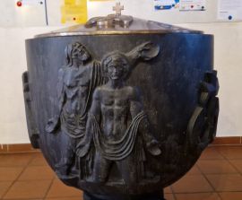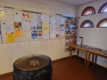 Darunter auf der rechten Seite findet man viele Informationen zu den Aktivitäten und Veranstaltungen der Pfarrei Theresa von Avila. Auch steht dort das Taufbecken.