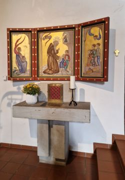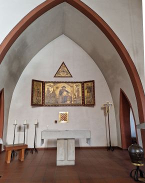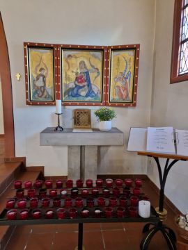 Vorn fällt der Blick auf dieses mit viel Gold gestaltete Altarbild, dass Jesus als den guten Hirten zeigt, der gerade ein Schaf aus Dornengebüsch befreit. Darüber ist das Symbol des Auges Gottes zu sehen. Wie alle Gemälde in dieser Kirche sind sie von Ruth Schaumann (1899 – 1955) geschaffen worden, einer uns bisher unbekannten, äußerst vielfältigen Künstlerin und Schriftstellerin, die als Kind an Scharlach erkrankte und dadurch taub wurde, doch das Ablesen von den Lippen erlernte. In ihrer Vielseitigkeit ist sie ein wahres Wunder Gottes.