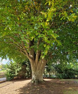 Zuerst wies sie uns auf diesen prächtigen Baum mit seinem schon so mächtigen Umfang hin, der jedes Jahr noch sichtlich größer wird und immer wieder beschnitten werden muss, um noch etwas von der Kirche sehen zu lassen. Dies, wie die Pflege des ganzen Grundstücks wird von Ehrenamtlichen der Gemeinde nun schon über viele Jahrzehnte geleistet.