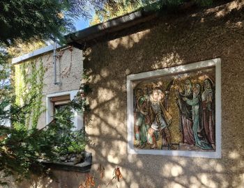 Grund dafür ist dieses Mosaik an der Hauswand, das eine Szene aus einer Heiligenlegende darstellt.