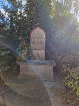 Gegenüber dem Kircheneingang befindet sich dieser Brunnen mit einem Bekenntnis zu dem Licht des Evangeliums.