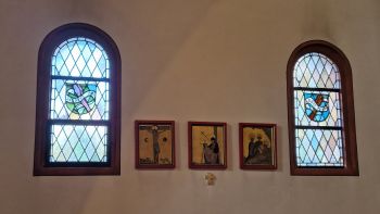 In den Fenstern werden mit ihren Symbolen die 12 Apostel Jesu geehrt.